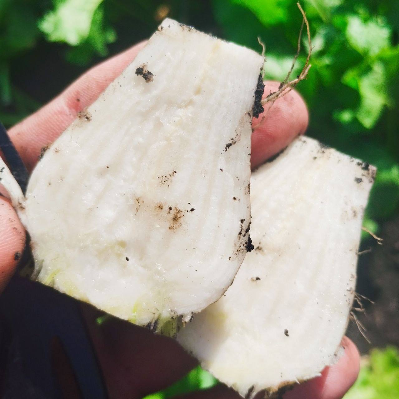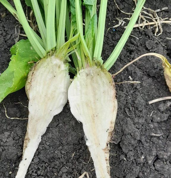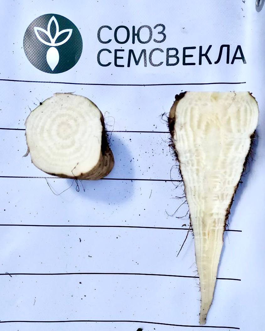 Далее представлен гибрид «молния» в Липецкой области. На 30 июня густота стояния растений составила 103 тыс. шт./га, фаза развития — 12-14 листьев. На фото в продольном разрезе корнеплода наблюдается светлый центральный проводящий пучок, что подтверждает здоровое развитие растения. Гибрид «молния» устойчив к кислым почвам, характеризуется стабильной урожайностью и длительной лежкостью.