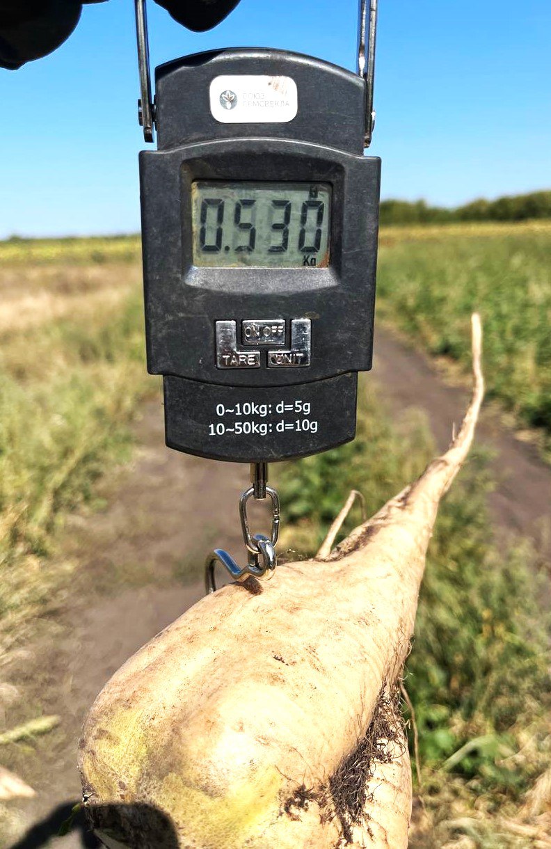 Производственный участок площадью 44 га с гибридом «скала» представлен на видео и фото (ниже) от 13.08.2024. Густота стояния растений составила 105 тыс. шт./га, средний вес корнеплода — 400 г. «Скала» — гибрид сахарной свеклы интенсивного типа, максимально устойчив к болезням листового аппарата.
