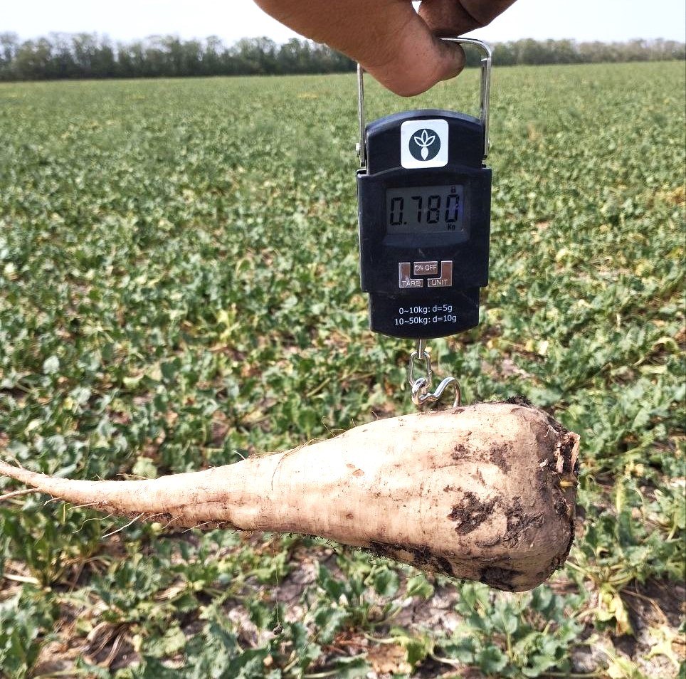 На видео и фото (ниже) представлен производственный участок площадью 43 га с гибридом «волна» в Отрадненском районе Краснодарского края. По состоянию на 03.09.2024 густота стояния растений составила — 110 тыс. шт./га, биологическая урожайность — 65 т/га. Фаза развития: смыкание междурядий. Гибрид «волна» сохраняет качество сока, сахаристость и массу в корнеплодах при высоких температурах — что актуально для южных областей — и длительном хранении.